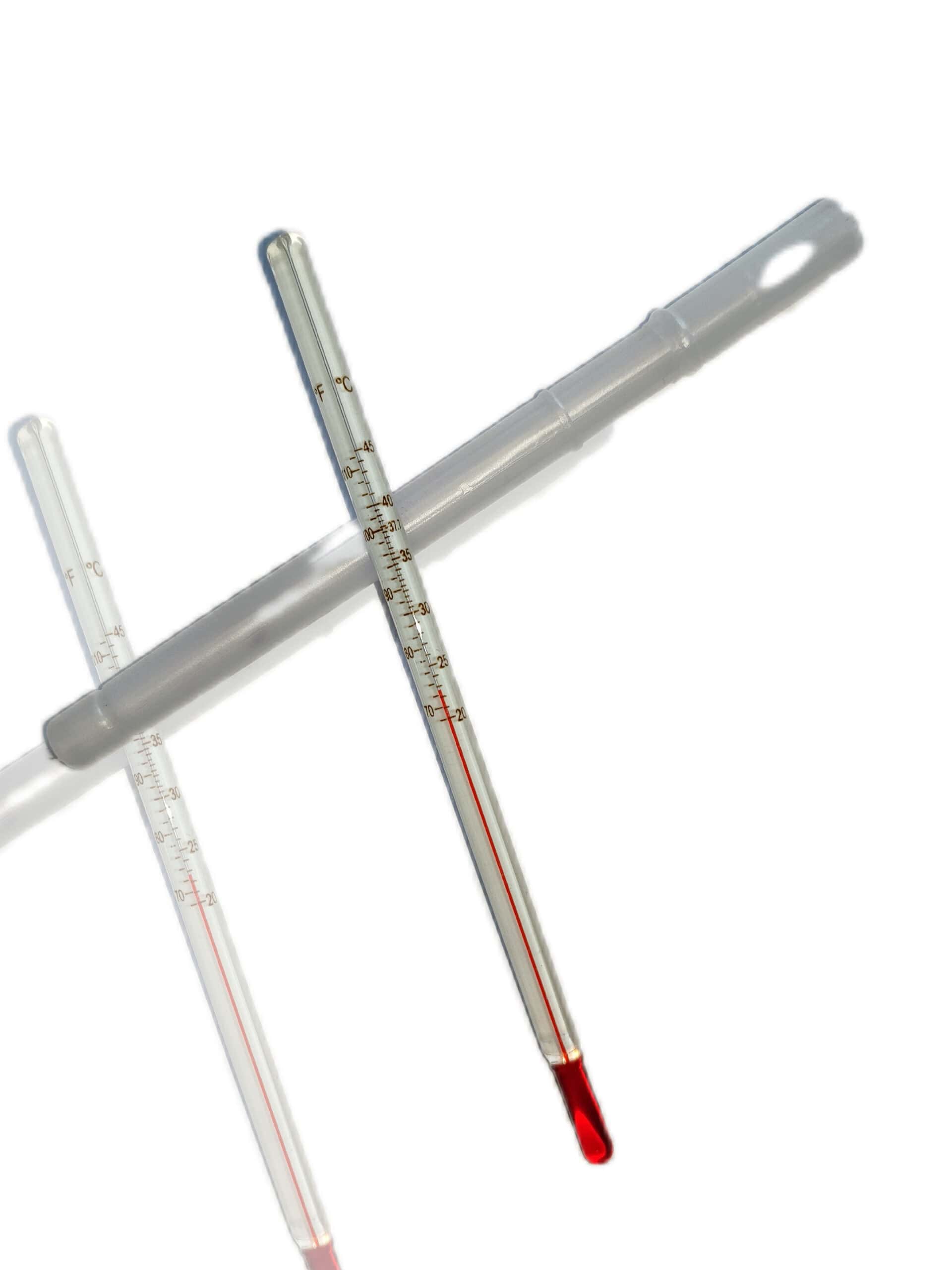 | Weergave in Celsius en Fahrenheit: | De thermometer toont temperaturen in zowel graden Celsius (°C) als graden Fahrenheit (°F), met markeringen op 100°F en 37,8°C voor gemakkelijke referentie. |
